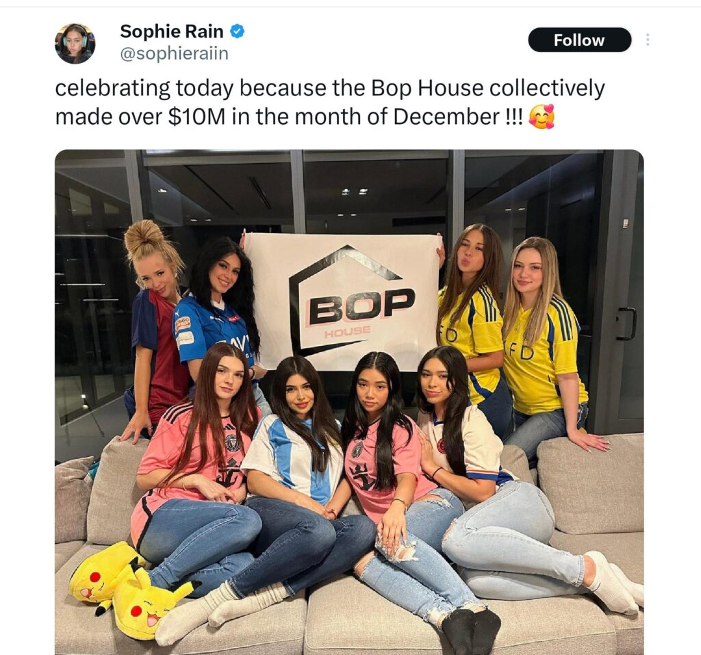 On December 9, 2024, Sophie Rain and fellow Content Creator Aishah Sofey announced their new venture on TikTok. The Bop House is branded as “your new favorite girls only influencer house” The announcement video was captioned “You can’t just make a house of Bops” followed by the defiant caption “Yes we can!”